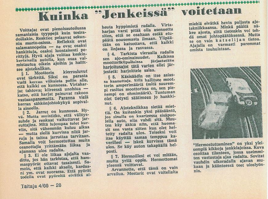Itse olen ajanut vuodesta -87 asti lähes tauotta, mutta ehkä hieman vakavammin vasta 2000-luvun alusta alkaen. Minusta hyvän kuljettajan tekee rauhallisuus ja kyky ajaa tilanteen vaatimalla nopeudella. Aina ei kannata ajaa täysillä, kun kalustoa on säästeltävä. Täysillä ajaessa tulee helpommin myös ulosajoja, jotka tekee turhaksi yrityksen. Ennakointi ja kolareiden välttäminen on myös tärkeää. Tässä asiassa katson siipiautoilutaustan tuovan etua, koska niissä rytisee helposti, jos ei osaa varoa kolareita.