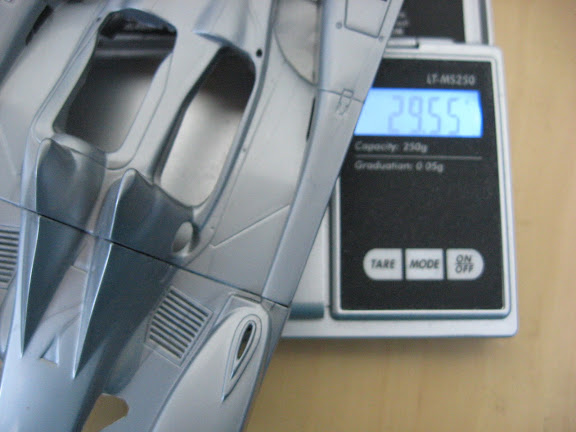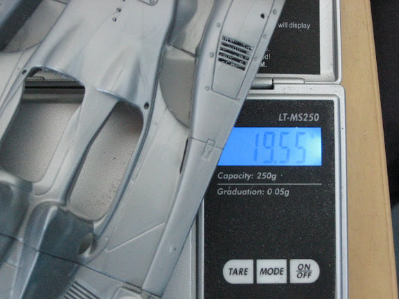 Eronahan noissa 20 - 30 gramman koreissa on se jyrsintätyö, mikä ei ole koskaan mukavaa! 20 grammaa on munkin mielestä maximipaino peruskorille, johon sitten kaikki muu tingeltangel asetellaan. Alle sen aina parempi. Mä tosin en enää vahvista hiilikuidulla. Esim. malliauto -puolelle tuleva Lamborghini Jotan peruskorin paino on tasan 20 gr. Ei siinä paljon jyrsittävää ole.