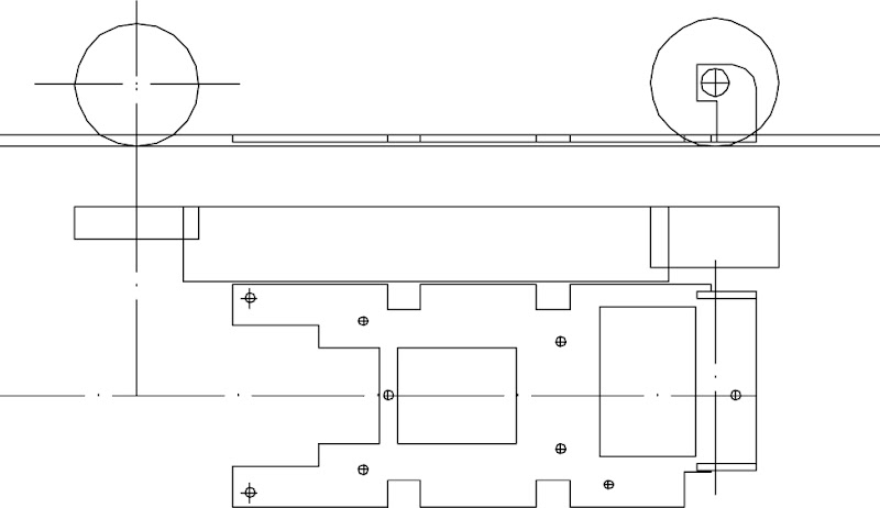 Kun pyörien sijainti oli määritelty oli helppo hahmotella korilevyt paikoilleen. Alkuvaiheessa teen korilevyt niin isoiksi kuin mahdollista. Rungon leveys peräti 81 mm. Vertaa Plafit SLP2: 77 mm. Korilevyt ovat myös erittäin pitkät; ne täyttävät lähes kokonaan etu- ja takapyörien välin. Materiaalina on ajatus käyttää 1,5 mm messinkilevyä. Eli painoa tulee mukavasti. Tarvittaessahan noita on sitten mahdollisuus keventää.