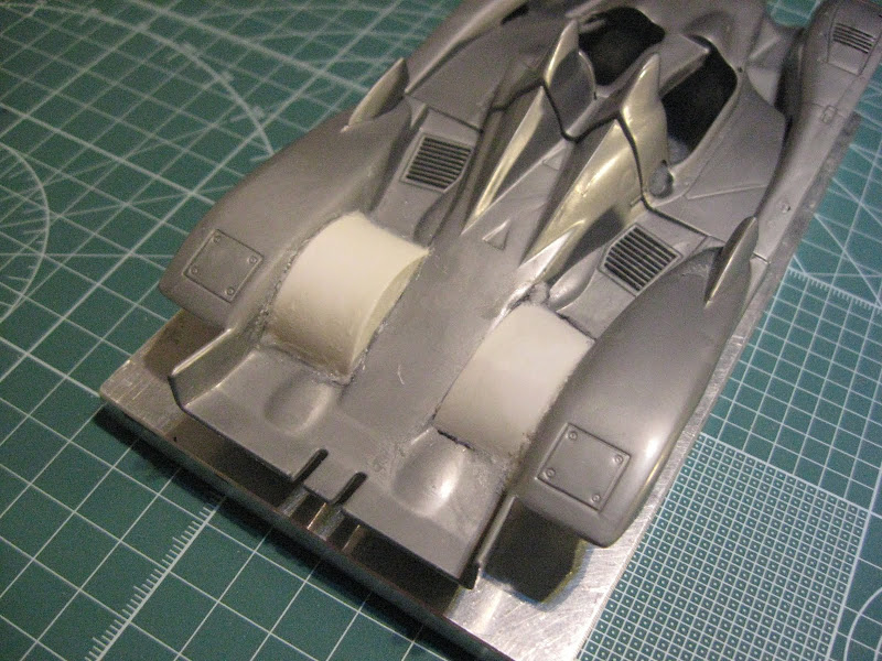 Parisen viikoa sitten muotoilin ohuesta polystyreeni levystä pullistukset vetopyörästöä ja laakeripukkeja varten korin takaosaan. Nykyaikaisen prototyypin kori on äärimatala takapäästä. Kovin kauniita pullistuksista ei tullut, mutta ei tässä luokassa concourse-pisteitä lasketa.