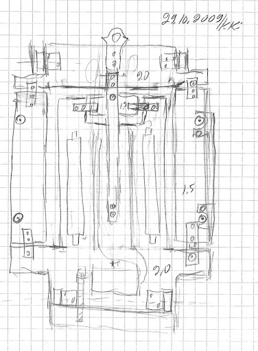 Ajattelin sitten tehdä koko rungon itse hiilikuitulevyistä. Pääasiallisena materiaalivahvuutena 2,0 mm, mutta esim. sivulevyt tulisi ohuemmasta 1,5 mm tavarasta. Näiden alle saisi lisäpainot wolframilevystä. Laakeripukkeina käyttäisin Plafitin palikoita edessä ja takana. Tuollaista tuli hahmoteltua: