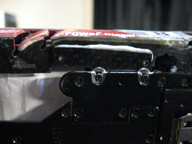 Sitten tyypillinen virhe. Aloin oikomaan korin kiinnityksessä. Tein hommaa keskiviikkoiltana ja haaveissa oli päästä testaamaan autoa Nokwoodin kerhokisaan torstaina. Väkästelin alkuperäisten korikiinnityslevyjen (terästä) tilalle omat 1,5 mm hiilikuitulevystä. Nämä ruuvasin korin sivulevyihin. Sitten mallailin kiinnikkeitä alustan saranoituihin sivulevyihin ja tein niihin kierrereiät.