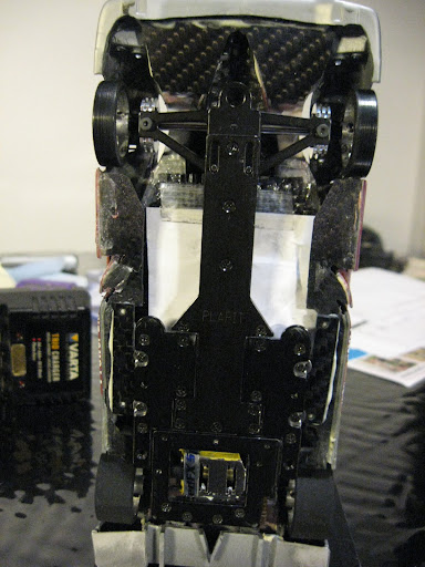 Yritin parantaa ajettavuutta sijoittamalla painoja eteen. Aluksi pistin lyijyä muutaman gramman eturipustuksien alapuolelle. Sitten vielä siirsin korin helmojen takaosassa sijaitsevat painot aivan eteen. Nämä toimenpiteet rauhoittivat autoa hieman, mutta ei siitä kovin hyvää tullut.