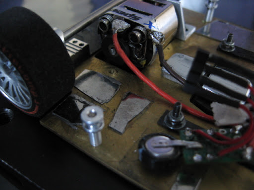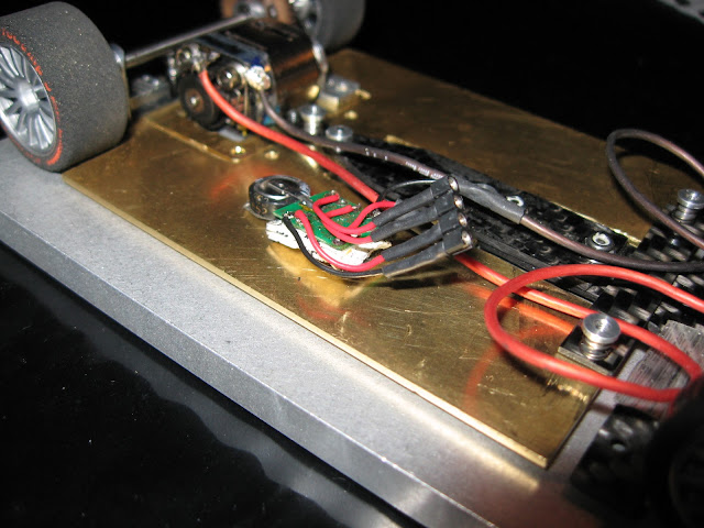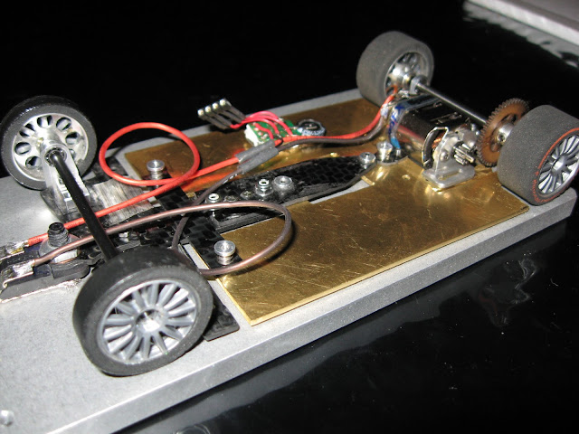 Auto meni siis muutaman gramman alipainoiseksi. Kisapainoon päästiin takaisin lisäämällä runkoon sopivasti volframilevyn paloja: