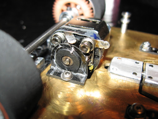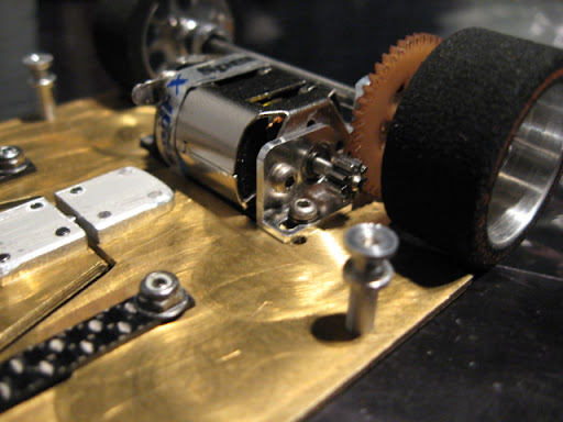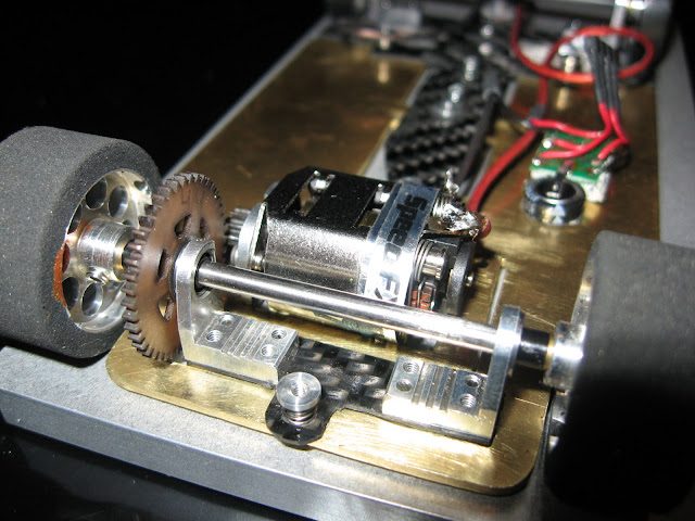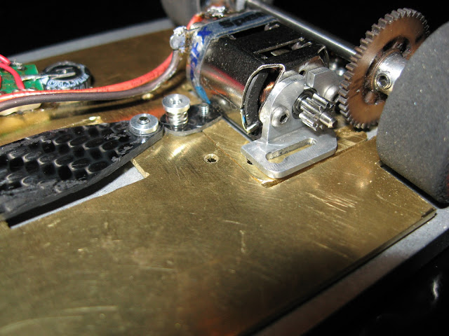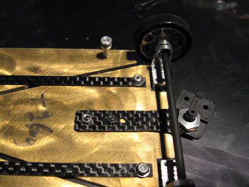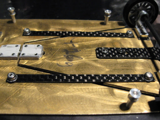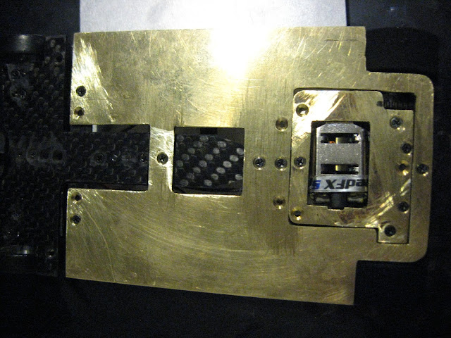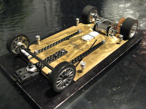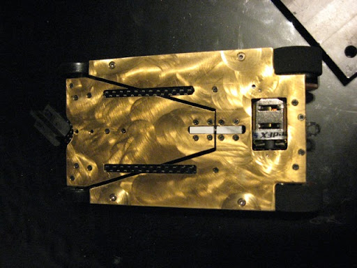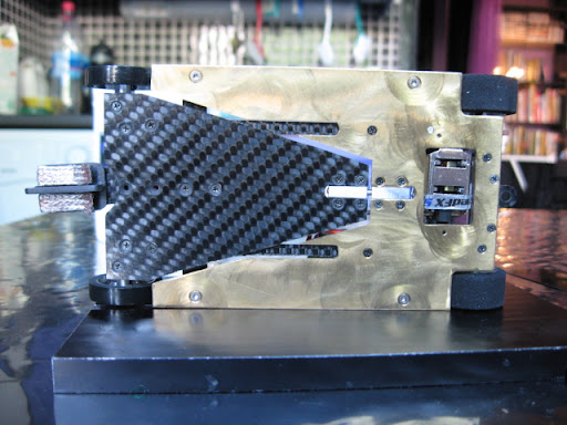 Messingistä jyrsitty alusta on erittäin painava. Kuvan asussa peräti 26 g ylipainoinen OEPS-protoluokkaan. Filosofiani oli kuitenkin tehdä koko auton pohja "täyteen". Tästä lähdetään sitten keventelemään. Todennäköisesti rungon etukolmio tehdään vielä uusiksi huulikuitulevystä.