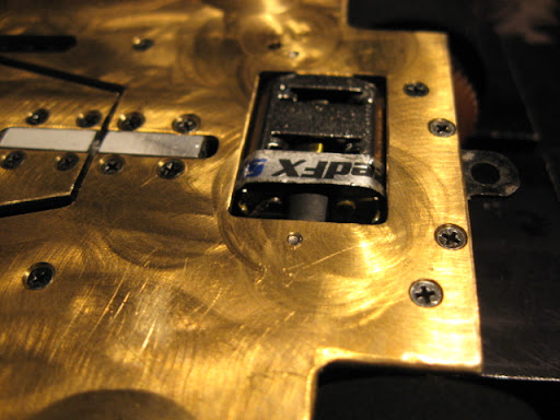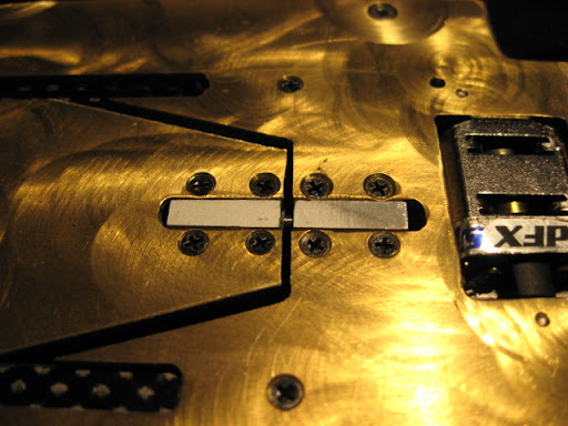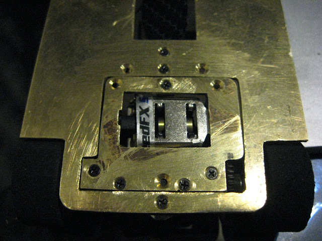 Runko pistettiin paloiksi viimeistelytöitä varten. Tarkoituksena oli keventää messinkilevyä n. 6,5 g, jotta päästään sääntöjen minimiin. Tämä onnistui kohtuullisen vaivattomasti. Valokitin kondensaattoria varten porasin takaosaan 10 mm:n reiän ja samoin toiselle puolelle. Nyt valokitin pystyy asentamaan niin matalalle kuin mahdollista. Rungon keskellä olevaa neliömäistä reikää avarsin muutamalla millillä ja etuosaan pari 7,5 mm reikää. Näillä pääsin painotavoitteeseen. Pelkkä paljas pohjalevy painaa nyt 64,0 g.
