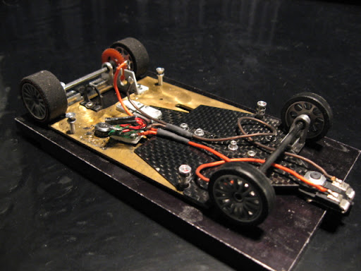 "Harjoitustyökseni" tein OEPS Audiin kokonaan uuden alustan 1,5 mm messinkilevystä. Aikani aihetta pohdittuani päätin tehdä keskisaranalla varustetun rungon. Kyseessä ei ole mikään uusi keksintö. Keskeltä saranoidun rungon on tiettävästi kehittänyt maineikas brittiläinen slottiharrastaja Ian Fisher vuonna 1977. Ratkaisun kerrotaan parantaneen autojen ajettavuutta huomattavasti. Malliautoissa en ole saranaa kuitenkaan koskaan nähnyt. Lukuunottamatta Eemelin kuplaa viime keväänä Hertsikassa.