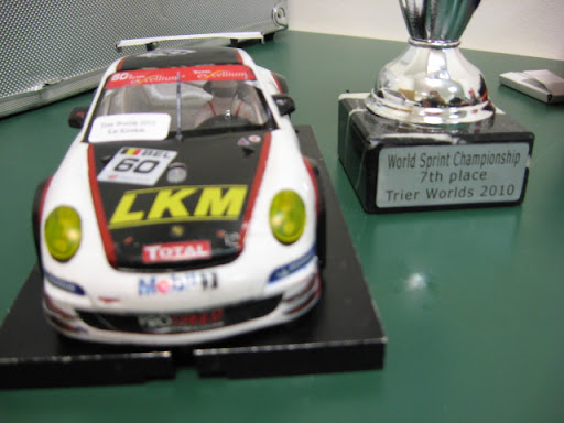Oheisissa kuvissa Porsche kuvattuna Trierin Sprint MM:n jäljiltä. Mitään ihmeellistä siinä ei tosin ole. Harjoituksissa en ollut täysin tyytyväinen auton käytökseen. Se kaatoi ja oli epävarma ajaa. Päädyin perinteiseen korjaustoimenpiteeseen; lisää punttia runkoon. Lisäsin n. 5 g lyijyä runkoon koneen eteen harjoitusten loppuvaiheessa. Tämä rauhoitti selvästi auton käytöstä ja auttoi parempiin kierrosaikoihin.