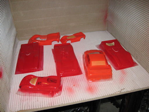 Toinen vaihe oli korin tekeminen 26D-versioon. Onnekkaasti romuvarastoistani löytyi iskemätön vanha McLaren M6A lexan-koppa. Yhtä onnekkaasti mulla oli Tamiyan oranssia PC-maalia, joten koppa saatiin McLarenin virallisiin 60-luvun tehtaan väreihin. Harmi, että ei ole esikuvan mukaisia tarroja tähän hätään. Jostain syystä maali vähän paakkuntui ja jouduin putsailemaan suuttimia, mutta sain kopan tyydyttävästi maaliin.