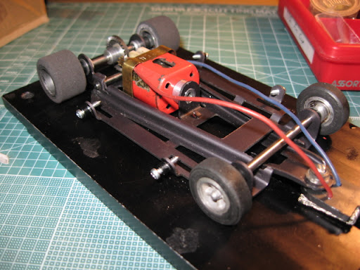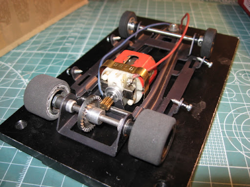 On the one you have, the Classic CM450 motor has been fitted with Arco magnets and a rewound, balanced armature of unknown origin but likely produced by the Mura company from its balancing pattern. The front wheels are aftermarket 1/32 scale Cox setscrew with the tires that come on them, and the rears are Cox IFC items. The crown gear and pinion are also by Cox.