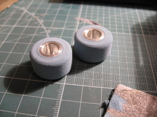 Löysin romuistani kovaksi kuivuneet mustat solukurenkaat kierrevanteilla. Ajattelin kokeilla onko siellä pehmeää kumia sisällä, joten pyörät sorviin. Kuten yleensä, niin ihan kelvollista solukumia sieltä paljastui kun vähän aikaa sorvasi.