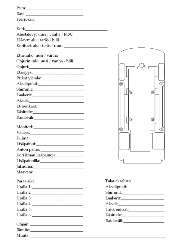 Itsekin olen vähän laiskistunut. Nykyään kirjaan lähinnä muutokset ylös. Mutta ainakin isoimpien kisojen jäljiltä kirjaan käytetyt kaikki säädöt ylös.
