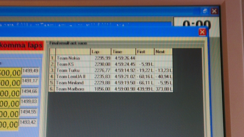 Yhdelläkään teamilla ei ollut minkäänlaisia ongelmia moottorin kiinnityksen kanssa. Koskaan en ole ajanut näin tasaväkistä 6 h kestävyyskisaa. Sijoitukset vaihtuivat lähestulkoon koko ajan. Järjestävä seura olisi voinut vielä prepata rataa hieman enemmän, niin oltaisiin saatu tuo harmaa ura tasaväkiseksi muiden kanssa.