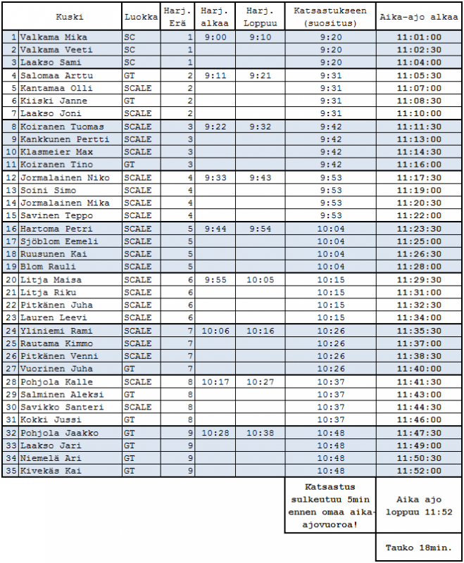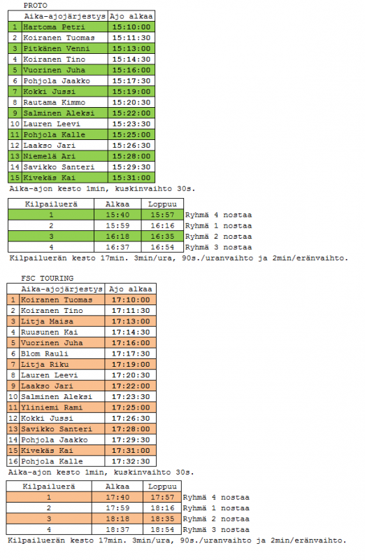 'Käänteinen' järjestys, eli kun ykkösryhmä ajaa, niin kakkosryhmä nostaa ja tulee sitten seuraavaksi radalle. Tällä päästään myös kuskien etsimisestä/paimentamisesta viivalle, kun ovat jo valmiiksi siinä hollilla.MaRi kirjoitti: Mites tuo oman harjoituserän jälkeinen nostovelvollisuus, kun pitäisi renkaatkin vaihtaa ennen suositeltua katsastusaikaa. ?