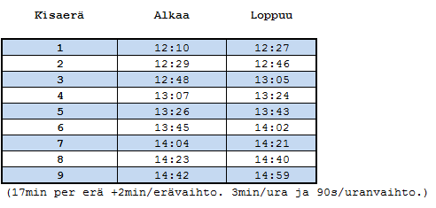 HUOMIO/OMSKAKAS FÖRE: JariL ilmoitti, että alkuperäisestä kilpailukutsusta poiketen kilpailu-areenan ovet aukeavat n. klo: 8.15, joten harjoitukset alkavat pyörimään 9.00.
