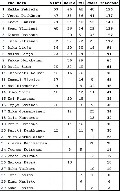 EDIT: korjattu näppäilyvirhe Joni Laakson pisteiden ja sijoituksen osalta.