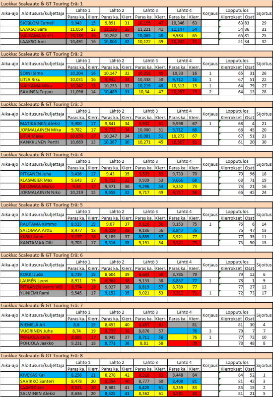 Hieman haasteellisen kaivamisen tuloksena sain kerättyä Riihimäen kisassa ajetut rataennätykset kasaan. Kisa oli poikkeuksellinen, sillä KAIKKI malliautojen rataennätykset menivät uusiksi. Siis ne luokat jotka olivat nyt mukana. Lienee rata ollut nopeassa kunnossa ja/tai kuskit valmistautuneet kisaan hyvin.