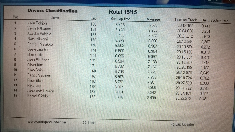 Harjoitukset alkavat jo 15:30, handout-renkaita on ja kisa alkaa aika-ajolla klo 18:10. Auto katsastukseen viimeistään 17:50 handoutit alle vaihdettuna.