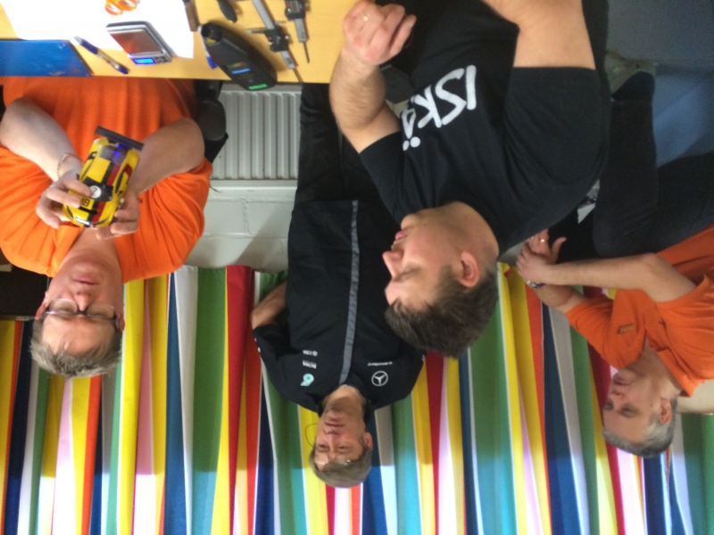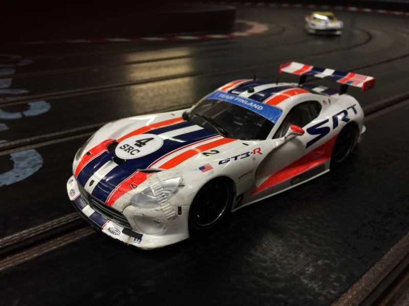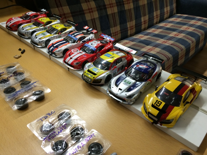 Katsastus toi sitten aika mielenkiintoisia juttuja mukanaan. Itse olin katsastamassa, eli siinä pääsi hieman näkemään mitä radalle oli menossa. Autoista katsastettiin myös se, kuinka kovaa moottori kiertää 12,5 voltilla. Yllättäen kolmen tiimin koneet kiersivät liikaa, joten ne jouduttiin vaihtamaan, junioritiimi oli yksi näistä. Koneen maksimikierroksiksi oli määrätty se nimellinen 26000 joka siis ei saanut ylittyä. Siitähän tuo arvo ei tietenkään kerro, mikä moottorin teho on, koska tuo ei huomioi vääntöä. Viime vuodesta poiketen tänä vuonna sallittiin myös Dodge Viper-kori, joka oli selvästi suosituin - Suomen, Ruotsin ja Tanskan tiimit olivat kaikki päätyneet siihen, Norjan tiimit ajoivat Audeilla. Autojen painoissa oli yllättävän suuria eroja - useimmat painoivat 205 gramman molemmin puolin (PM-säännöissä sallitaan lexan-ohjaamo ja lasit, joten painon pitäisi helposti mennä alle 200 gramman). Suomen joukkueilla autot olivat ihan kevyimmästä päästä, molemmilla alle 195 gramman. Aika moni tiimi oli rakentanut auton maavaran ihan sääntöjen mukaiselle alarajalle, joutuipa joku tiimi nostamaankin sitä vielä katsastuksessa. Olivatko sitten luulleet että alle heitetään uudet handoutit - säännöthän sanoivat että ajetaan 27,5mm:iin sorvatuilla handout-pyörillä...