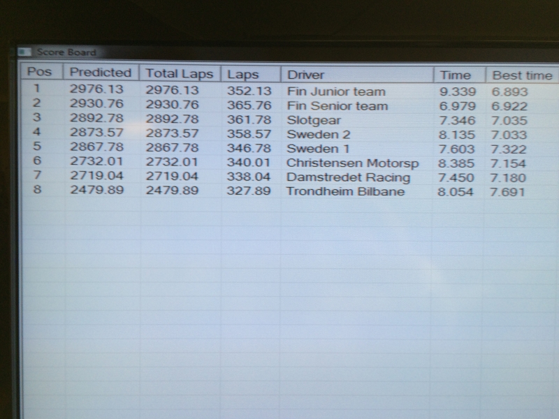 Senioreilla kuitenkin n. 60 kierrosta etumatkaa Slotgeariin (DK), tiukka loppukisa tulossa. Myös Sweden 1 on Slotgearin tuntumassa kun pinjonit ovat nyt pysyneet paremmin kiinni.