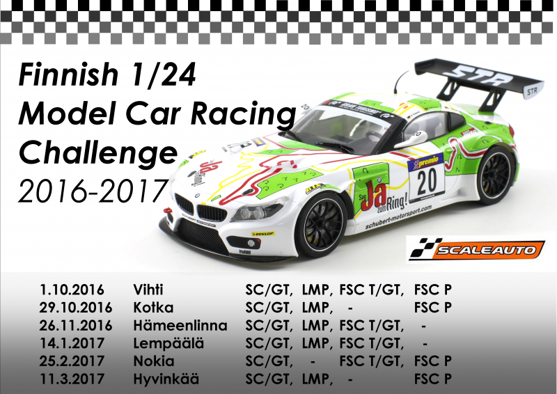 Ajettavat luokat: Finnish Scaleauto Challenge/Finnish GT Challenge, Finnish LMP Challenge ja FSC Challenge (GT/Touring/Tonni)