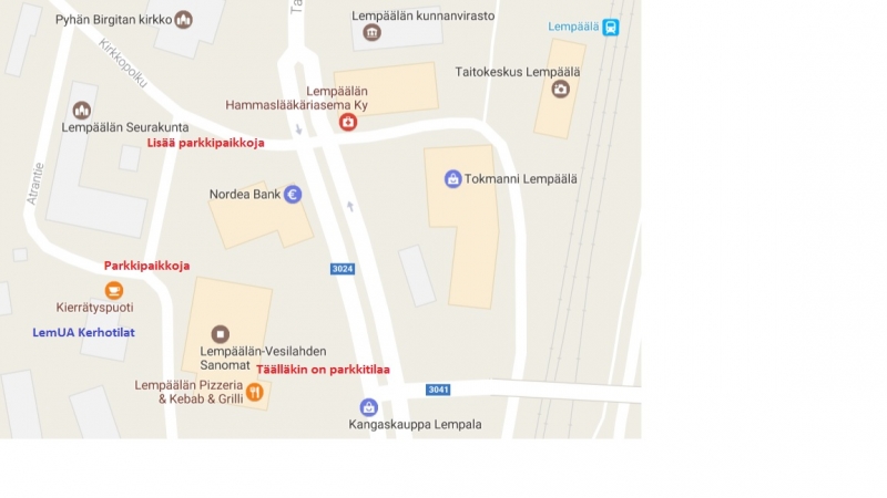 -Jos kirkon takana ja etupihalla ei ole parkkitilaa, niin Lempäälän kebabgrillin parkkipaikalla on vielä lisää ruutuja, kuva liitteenä.