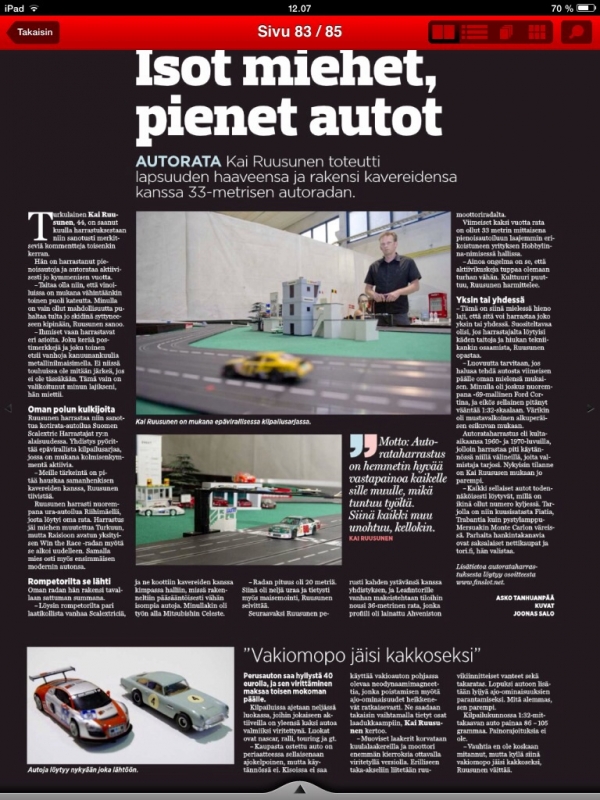 JariL kirjoitti: Tänään 17.1.2014 ilmestyneessä VauhdinMaailma lehdessä on kahden sivun juttu Scaleautoista ja autoratailun aloittamisen helppoudesta.