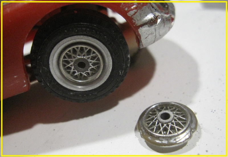 Auton kunnostus vaati lyhyessä ajassa sopivasti innovaatioita ja löysin siihen kierteettömän taka-akselin ja renkaat vanteineen Parman Whisper Jetistä. Ylisuuret renkaat olivat umpikoppurat, mutta kun niistä poisti sorvissa n. 60% materiaa, niin se mitä alta paljastui oli WD:llä ja taatusti vintageikäisellä pitoaineella elvytettävissä. Eturenkaat tuottivat seuraavaksi päänvaivaa ja vasta useamman laatikon kaivettuani hoksasin käytöstä poistetut Airfixin "ilmatäyttiset" renkaat. Ne kuuluivat perinteisemmälle 3/32 tuuman akselille joten tuli sitten asennettua tähänkin autoon messinkiputki etuakselia kannettelemaan. Tuo messinkituubi kun sopii hyvin rungossa olevaan isommalle tuumaiselle akselille tarkoitettuun läpivientiin! Korikiinnikkeet leikkasin 1/32 Carreran protokorista ja ne liimattiin koriin Plastic Welderillä. Tämäkin auto pelasi hienosti Nokialle kun ottaa huomioon se valmistui edellisenä iltana!