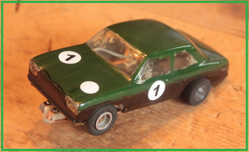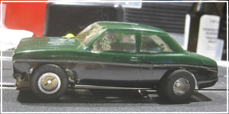 Tämä 60 -lukuinen voimakaksikko löytyi huhtikuun alussa Turusta ja ne oli kertakaikkiaan mukava saattaa ajokuntoon Nahinoihin. Toisesta autosta puuttuu ohjuri, molemmista breidit ja autoihin oli saatava uudet takarenkaat. Lisäksi vaihdoin autoihin tanakammat kaapelit sillä alkuperäiset virtajohteet olivat hyvin heiveröisen oloiset (Scalextricin ensiasennusjohtoja vastaavat) ja suoraan sanoen epäilin niiden kykyä välittää koneeseen virtaa! Autojen takarenkaiden elvyksessä suurin kiitos menee Kivekkään Kaitsulle joka antoi vinkin renkaiden fiksaamiseen, toisen vinkin mistä renkaat saan hankittua ja kolmanneksi vielä sorvasi renkaat toivomaani mittaan. Harjoitusajojen kustannuksella sain autot valmisteltua varikolla valmiiksi ennen kisaa, missä ne toimivat hyvin ja ennenkaikkea tulivat ehjänä maaliin.