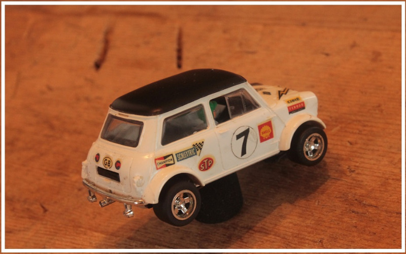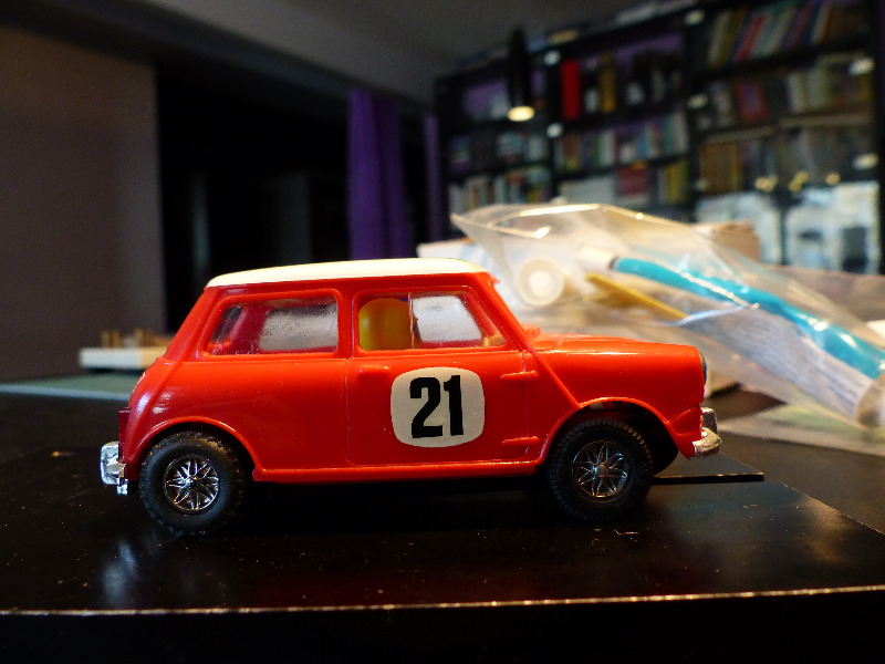 Valitsin autokseni Espanjan Scalextricin (Exin) tuotoksen, joka esiteltiin vuonna 1970. C45 Mini Cooper. Malli on ollut kohtuullisen harvinainen näky Suomessa. Seikkaan vaikuttanee varmaankin se fakta, että mallina se on epäonnistunut. Jostain syystä mallin keula on esikuvan mittasuhteisiin nähden ylipitkä, ja tekee autosta melko omituisen näköisen. Lisäksi alustan ja korin akselivälit eivät ole yhtenevät jolloin etupyörät eivät istu pyöränaukkoihin nätisti. Nämä seikat ovat nähtävissä oheisista kuvista. Tämän tyyliset mokat ovat yllättäviä, sillä tyypillisesti Exinin tuotokset olivat erittäin mittatarkkoja tuohon aikaan ja selvästi hienompia kuin englantilaisen emoyhtiön tuotokset..