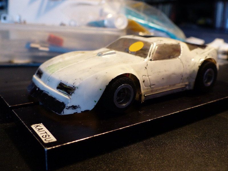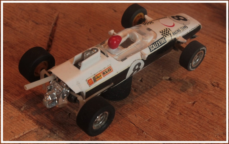 Onnistuin kuitenkin löytämään omasta ohjurivarannosta aihion josta muotoilemalla ja koriin holkittamalla sain sen toimimaan etupyörien kääntöä myöten. Virtatallat poistin huonosti toimivana autosta kokonaan ja valmistin räätälintyönä pidikkeet tavanomaisemmille breideille. Ensimmäisiin kuvaussessioihin laitoin autoon alle renkaat Scalextricin XKRS Jaguarista tekstipuoli sisäänpäin käännettynä ja samat renkaat olivat alla kisassakin - tosin hieman hiomapaperin päällä niitä kuperuuden vuoksi pyöräytin. Kisassa autoa ajoi Aapo Terviö.