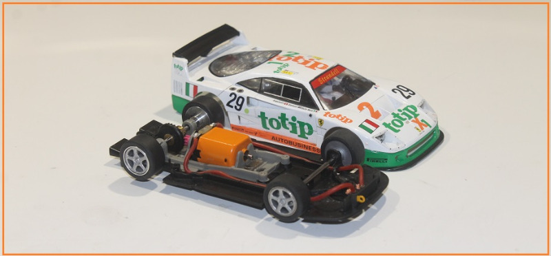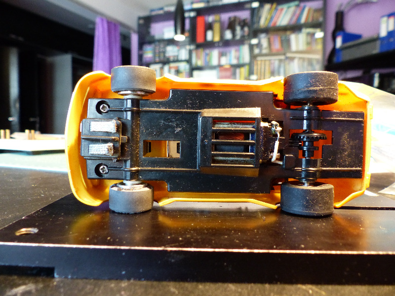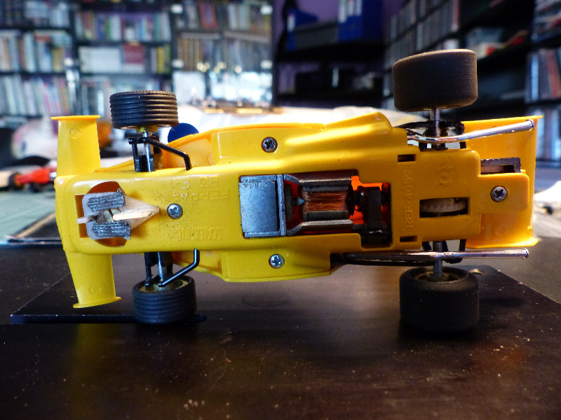 Sisältä likainen kori ja alusta putsattiin ja alkuperäisen moottorin paikalle istutin Scalextricin 25 K pannun 9/27 välityksellä. 27 -kruunuratas taka-akselilla on Slot.it -valmisteinen ja Scalextricin moottorin alkuperäiset virtajohdot vaihdoin Slot.it:lle tyypillisempään malliin. Myös alkuperäistä vastaavan magneetin laitoin moottoripukkiin paikalleen - kyseessä kun ei ollut viritys vaan auton ajokuntoon saattaminen ja alkuperäiseyyden tukeminen.