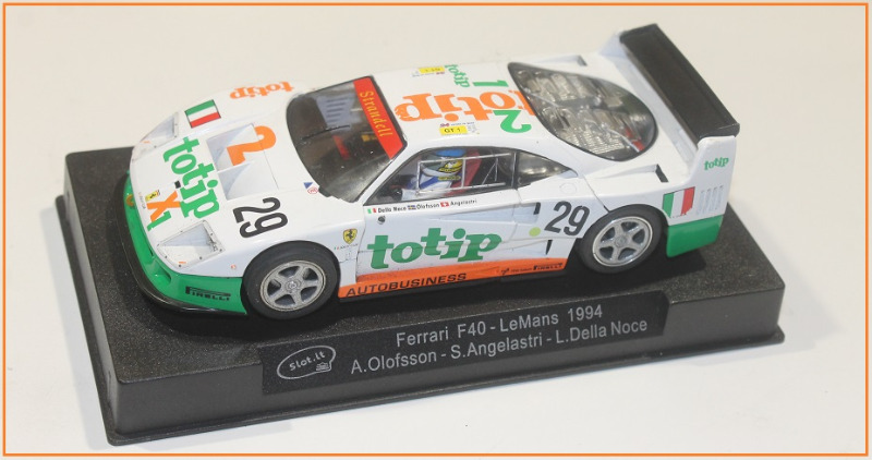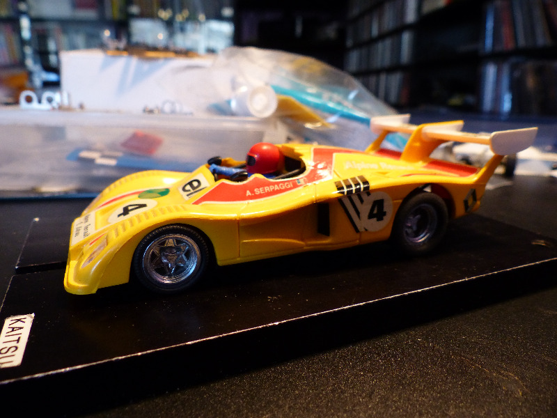 Puuttuvat alkuperäiset Slot.it -merkinnällä varustetut renkaat taakse löytyivät omasta valikoimasta ja auton alkuperäinen laatikkokin löytyi kaapista. Mukava yhden illan projekti ja tämän jälkeen on helppo ottaa pöydälle toinen vastaava - Lancia LC 2.