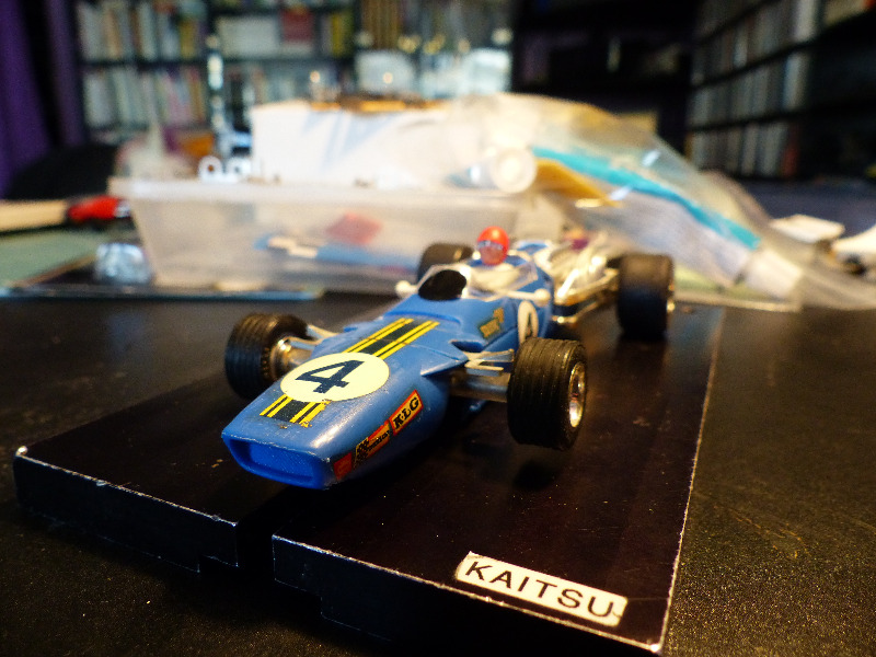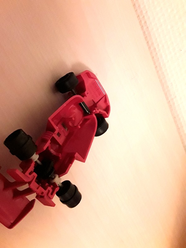 Sen verran tuli testattua, että totesin osaavani juottaa piuhat kiinni moottoriin ja muukin tekniikan kokoaminen onnistuu. Tuo auto johon sai ohjurin kiinni, osoittautui oikeinkin rivakasti liikkuvaksi, tosin enemmän sivusuunnassa kuin eteenpäin. Hätäisempi voisi etsiä syyllistä puuttuvasta spoilerista tai ajotaidosta, mutta hitaana ja rauhallisena ehdin miettimään, että liikkeellelähtö suoralla pitäisi onnistua ilman koko radan leveyttä, varsinkin pintakaasulla. Joten lienee aika vaihtaa nuo vuosikymmeniä vanhat takarenkaat tuoreempiin. Eturenkaista ainakin yksi taitaa murentua ensimmäisten kierrosten jälkeen, joten niitäkin pitänee haalia. Tekemistä riittää, mutta uskoisin että lopputulos sitten aikanaan korvaa uurastuksen. Jos nuo joskus valmistuu...