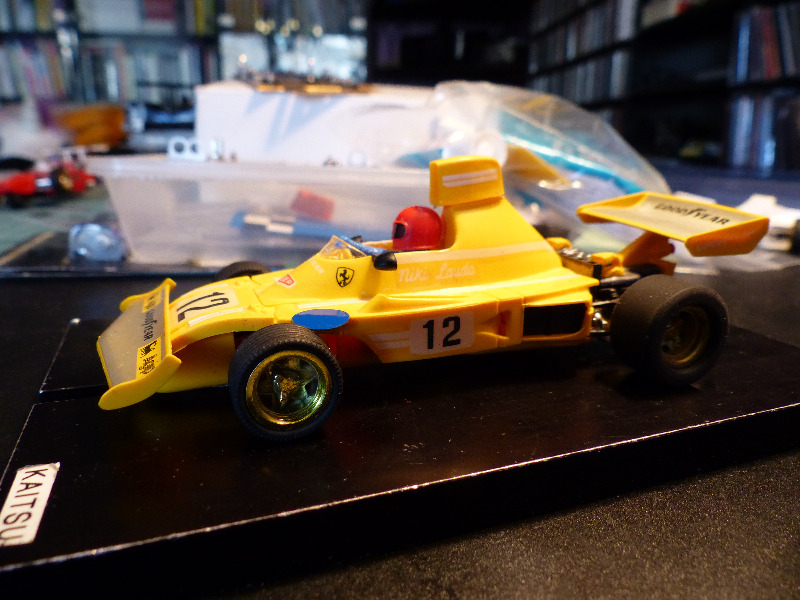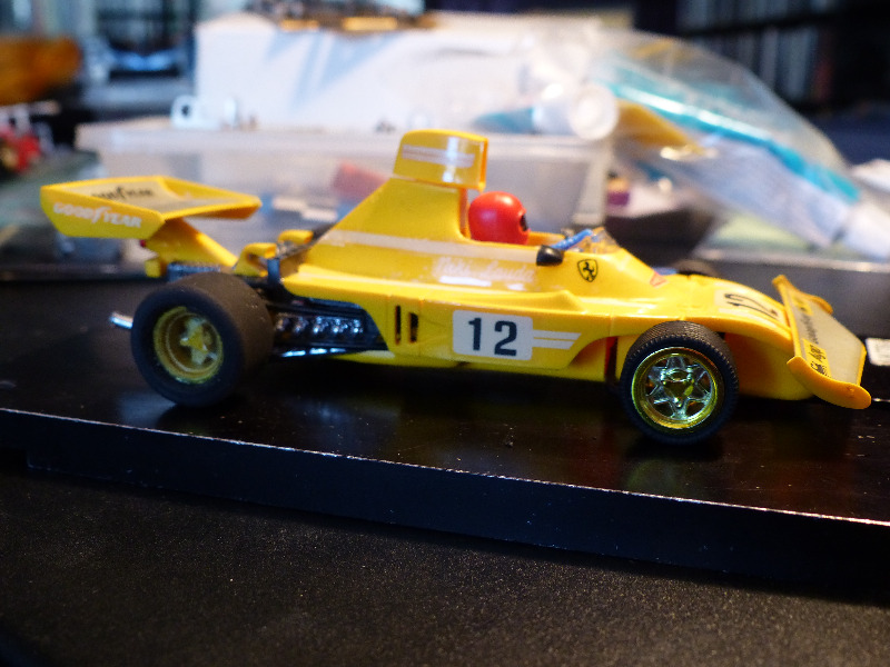 Modernimpaan formulaluokkaan myös ennenkokematonta kalustoa. Kyseessä jälleen Exinin valmiste. Tällä kertaa vuonna 1975 esitelty 4052 Ferrari 312 B3. Auton esikuva on malli, jolla Niki Lauda ja Clay Regazzoni kilpailivat hyvällä menestyksellä F1 MM-sarjassa kaudella -74 (ja pari kisaa vielä -75). Itseäni lähinnä harmittaa, että tuli aikoinaan hankittua tuommoinen esikuvaton keltainen yksilö. Myöhemmin piti hankkia 'aito' punainen, mutta jostain syystä se on jäänyt. Täytynee ehkä terästäytyä tässä suhteessa.
