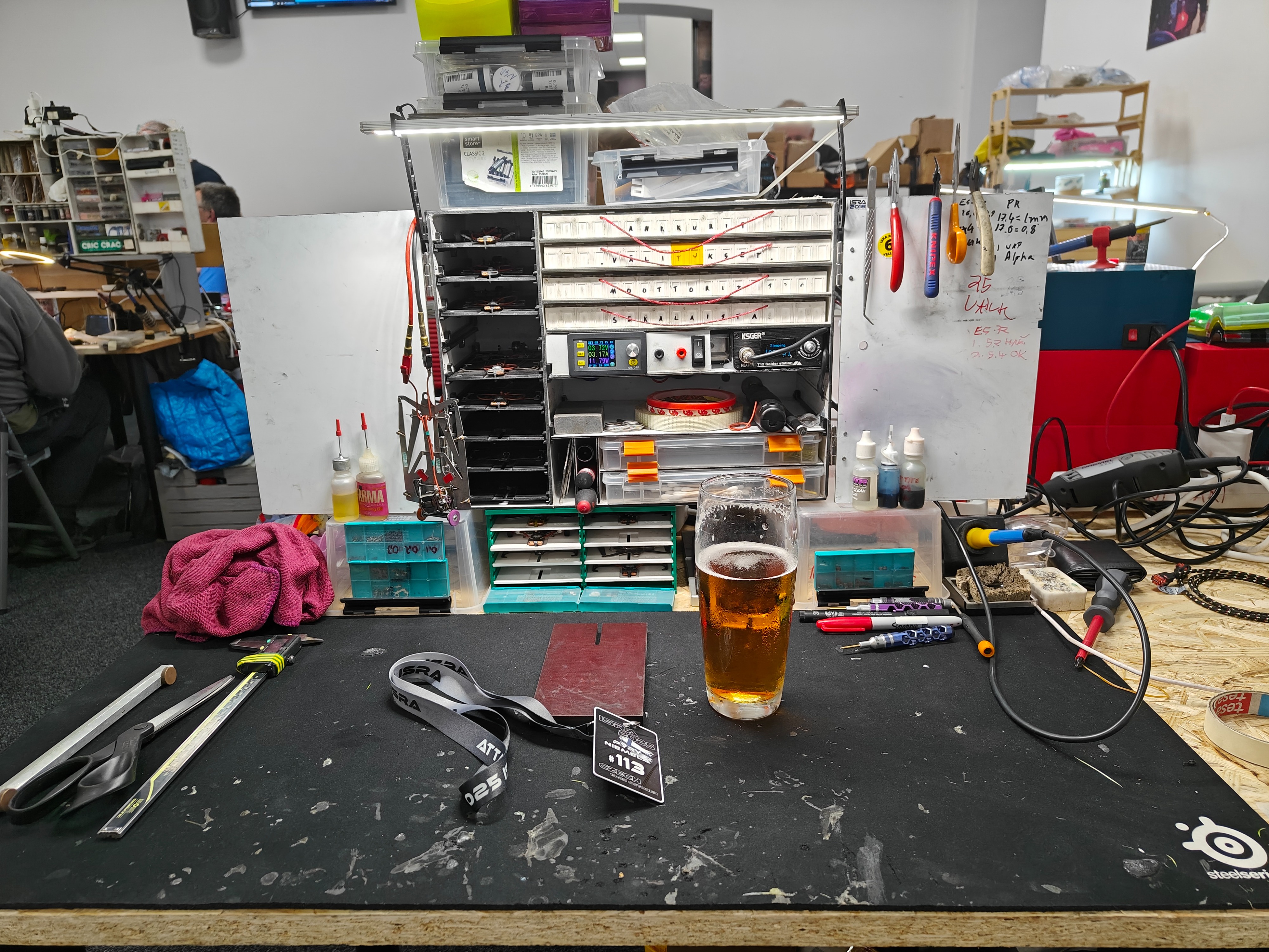 Sitten päästiin pakin järjestelyn pariin. Monet työkalut ovat seilanneet ympäri pakkia. Oven yksi hylly oli turha, eikä sinne mahtunut oikeastaan mitään merkityksellistä. Poistin yhden hyllyn ovesta ja siirsin toista ylöspäin. Näin saatiin magneettilista oveen ja siihen saatiin useasti käytettyjä työkaluja, kuten pihdit ja harjattomien moottoreiden kuusiokolot. Toiseen oveen virittelin paikat viivaimelle, työntömitalle sekä pitkille fiskarsseille.