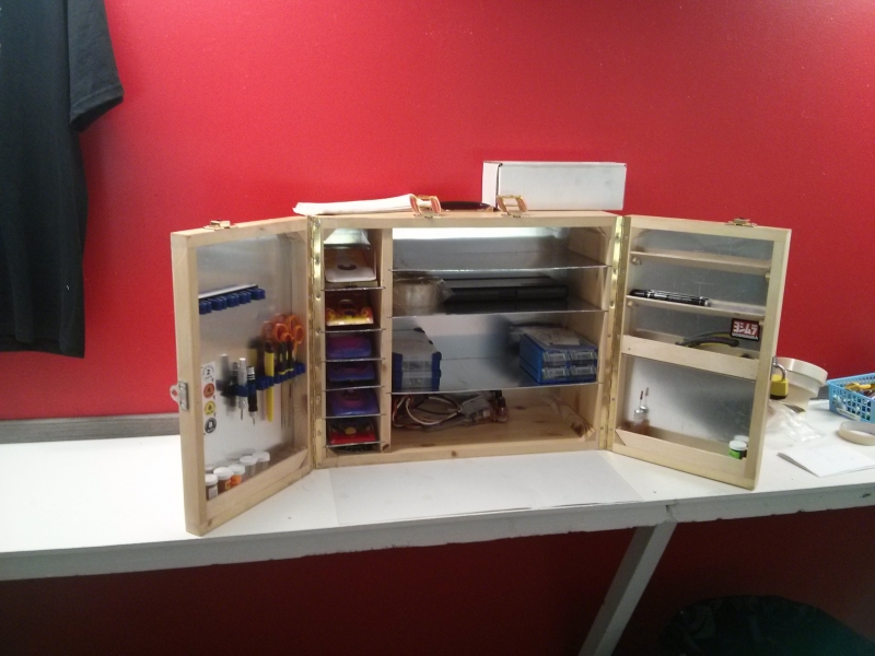 Tuosta on hyvä kehittää eteenpäin - kun olet tuon kanssa muutamat ekat kisat käynyt, niin tiedät paremmin missä minkäkin työkalun on kätevintä sijaita. Jos kaikki painava ei mahdu pakin lattialle, niin alimman hyllyn alle keskelle tuki niin vot.