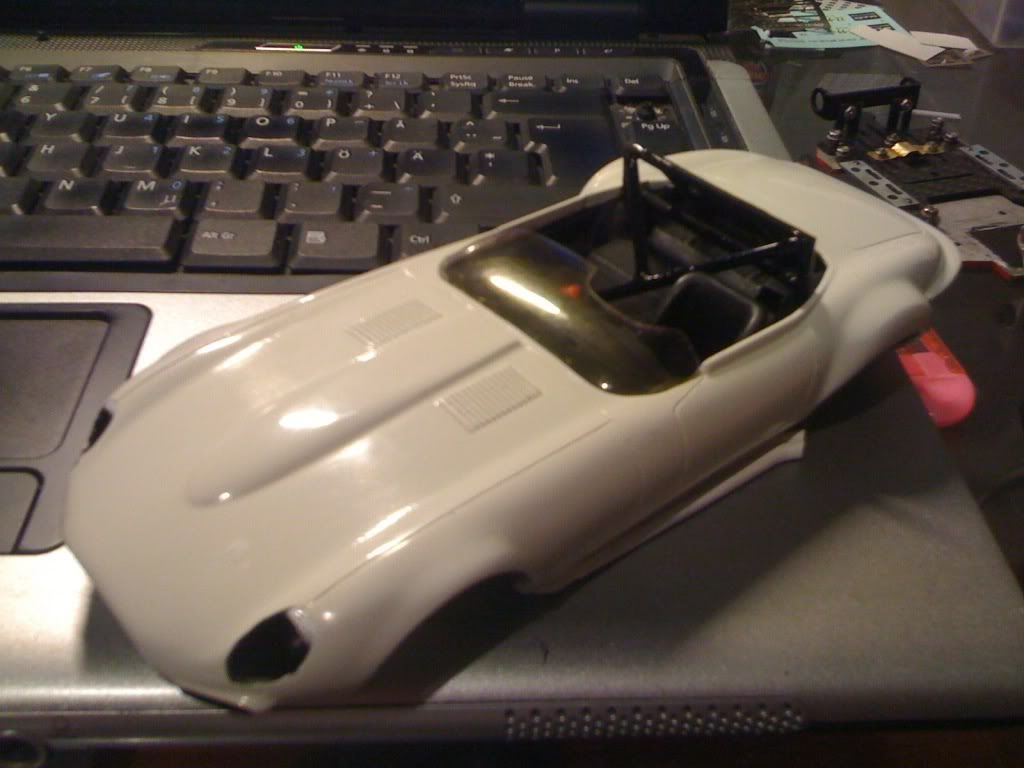Täällä on koitettu jo jonkun aikaa saada Jaguar E-Type. Kori on Spickerin. Koulutöiden ohessa on koitettu aktiivisesti saada valmista viikonloppuisin. Nyt on enään renkaita ja korikiinnikkeitä vaille valmis.
