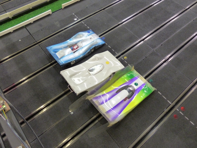 Päivän päätteeksi tuupattiin vielä "kilpakoneilla" isoa kovaa kun radalla saatiin kaikkiaan kolme menneiden vuosikymmenien 1/24 slottiraaseria. Näistä kaksi toi radalle Laakso. Autojen (joista toinen oli siipipeli) rakentajana toiminut Riihimäen kerhoa vuosikymmenet vetänyt Timo Kolehmainen. Kivekkään auto oli puolestaan VP Immosen (R.I.P.) vuonna -77 rakentama Lk3 Grp 20 -laite, joka tosin oli menettänyt siipensä entisöintityön yhteydessä.