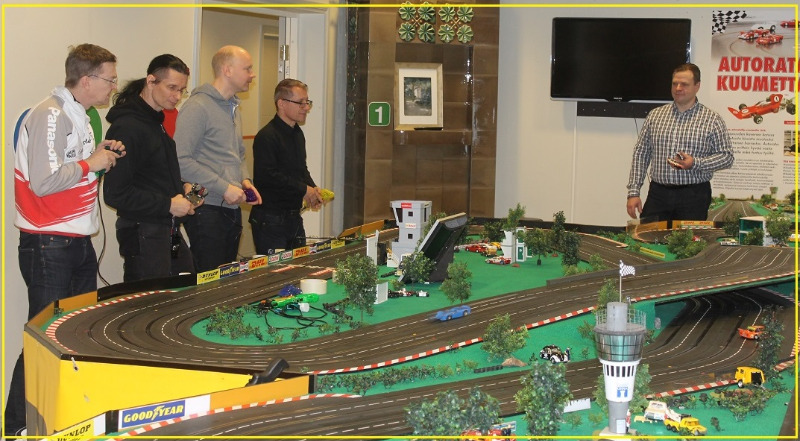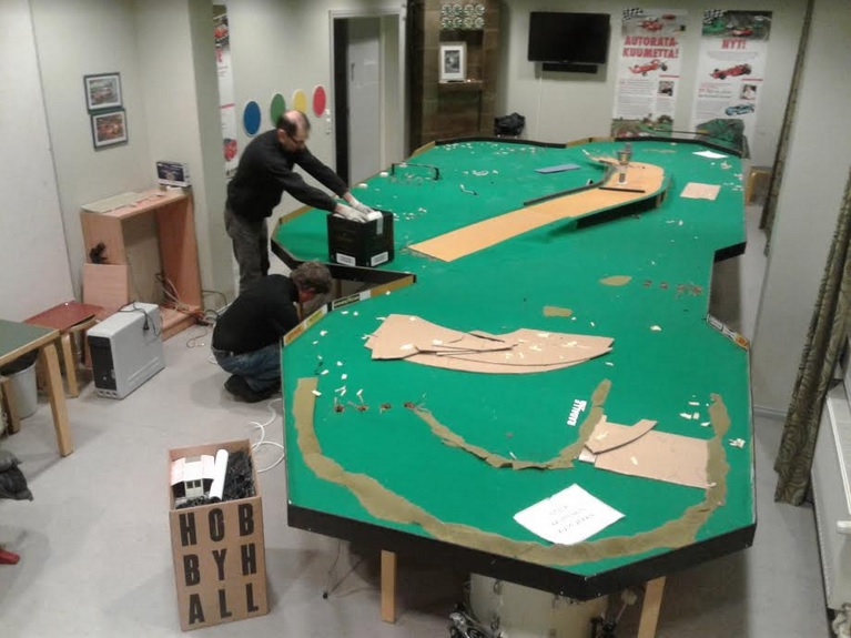 Purkuapuna Jyrki Saarinen ja Mika Sandell. Jyrki oli radan radan ahkeri kävijä (omien laskujensa mukaan tänään 33. kertaa radalla). Mika taas on vasta hommasta innostunut ja ensimmäiset autot ja viriosat jo Minilandin kautta hankittu. Harmillisesti tämä rata lähti alta mutta onneksi ovet myös Kauppilan Timon radalle avoinna.