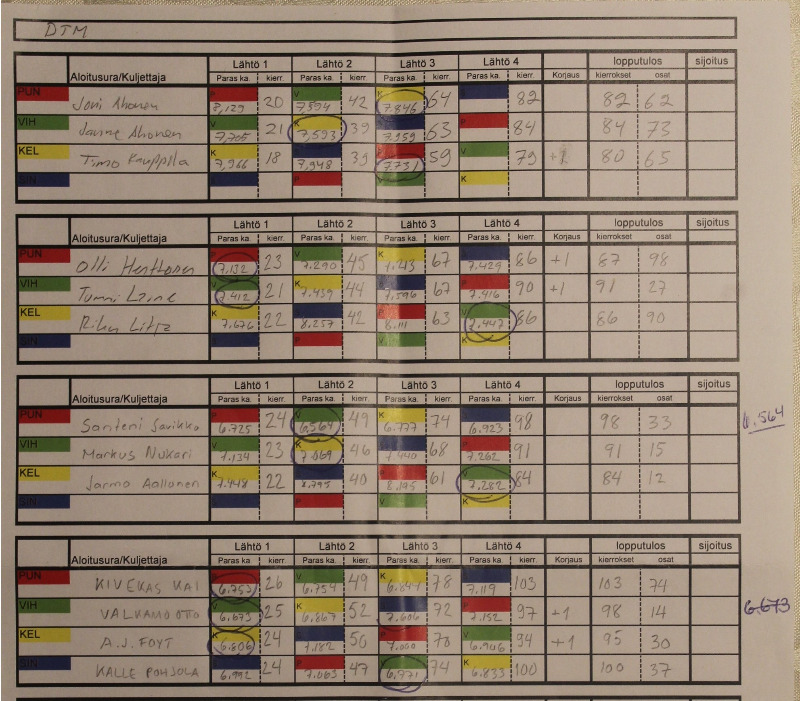 Harmillisesti joitakin viimeisten heatien aikoja puuttuu koska erän päättyessä on siirrytty kirjaamaan suoraan tuloksia ja osia. Itse en tosin tässä forumilla saanut noita kuvia zoomattua samoin kuin omalla koneella, jossa tulokset näkyivät käsinkirjauksesta huolimatta selkeästi.