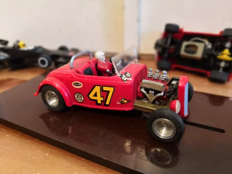 Vintage ajelut lähestyy ja oli aika aloittaa kaluston eheytys. Harvinaisimmasta ja haasteellisimmasta ajokista. Monogram 1/32 Deuce, joka on tehty 1964 ja melkoinen keksintö kyseessä onkin. Runko on ikäänkuin väärinpäin. Eli runkolevy ylhäällä ja moottori rungon alapuolella ja ohjuri reilusti etuakselin takapuolella. Ajokki oli lähtökohtana varsin ehjä ollakseen 55 vuotta vanha, joten hommasta selvisi vaihtamalla 2000 luvun laahaimet ja johdot jäykkien "rautalanka" laahaimien ja johtojen tilalle +laakereihin öljyä ja tuoreemmat renkaat alle.