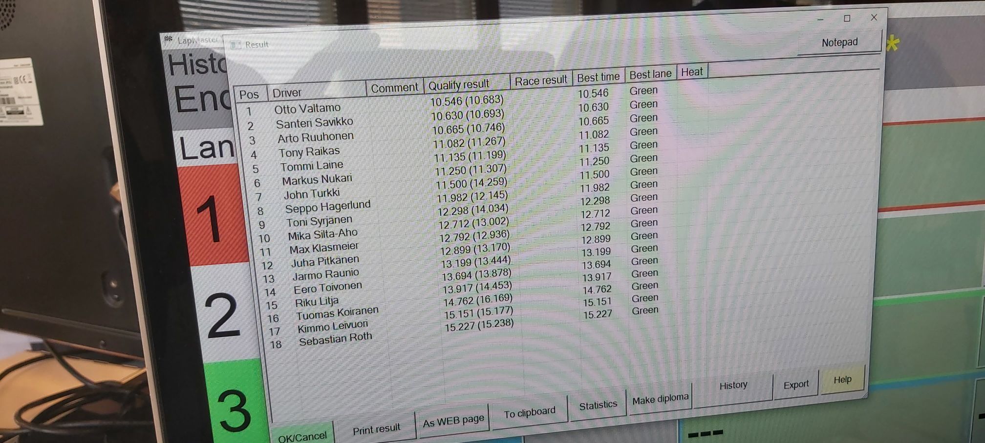 Erityis kiitos kilpailun johdolle avustajineen hyvin johdetusta ja läpiviedystä kisapäivästä, sekä toive nähdä ensi kertaa kisailleet kuskit jatkossa muillakin radoilla.