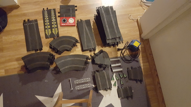 Myyn eniten tarjoavalle oheisen kuvan mukaisen läjän Scalextric classic-rataa + tarvikkeita.
