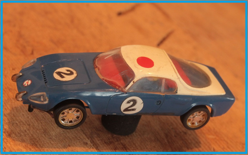 Tämä 60 -lukuinen voimakaksikko löytyi huhtikuun alussa Turusta ja ne oli kertakaikkiaan mukava saattaa ajokuntoon Nahinoihin. Toisesta autosta puuttuu ohjuri, molemmista breidit ja autoihin oli saatava uudet takarenkaat. Lisäksi vaihdoin autoihin tanakammat kaapelit sillä alkuperäiset virtajohteet olivat hyvin heiveröisen oloiset (Scalextricin ensiasennusjohtoja vastaavat) ja suoraan sanoen epäilin niiden kykyä välittää koneeseen virtaa! Autojen takarenkaiden elvyksessä suurin kiitos menee Kivekkään Kaitsulle joka antoi vinkin renkaiden fiksaamiseen, toisen vinkin mistä renkaat saan hankittua ja kolmanneksi vielä sorvasi renkaat toivomaani mittaan. Harjoitusajojen kustannuksella sain autot valmisteltua varikolla valmiiksi ennen kisaa, missä ne toimivat hyvin ja ennenkaikkea tulivat ehjänä maaliin.