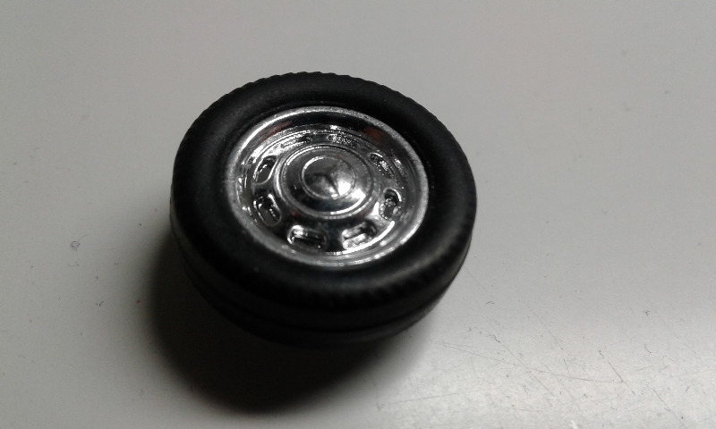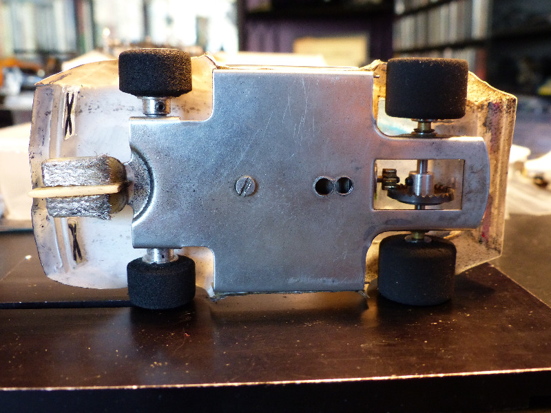 Auton kunnostus vaati lyhyessä ajassa sopivasti innovaatioita ja löysin siihen kierteettömän taka-akselin ja renkaat vanteineen Parman Whisper Jetistä. Ylisuuret renkaat olivat umpikoppurat, mutta kun niistä poisti sorvissa n. 60% materiaa, niin se mitä alta paljastui oli WD:llä ja taatusti vintageikäisellä pitoaineella elvytettävissä. Eturenkaat tuottivat seuraavaksi päänvaivaa ja vasta useamman laatikon kaivettuani hoksasin käytöstä poistetut Airfixin "ilmatäyttiset" renkaat. Ne kuuluivat perinteisemmälle 3/32 tuuman akselille joten tuli sitten asennettua tähänkin autoon messinkiputki etuakselia kannettelemaan. Tuo messinkituubi kun sopii hyvin rungossa olevaan isommalle tuumaiselle akselille tarkoitettuun läpivientiin! Korikiinnikkeet leikkasin 1/32 Carreran protokorista ja ne liimattiin koriin Plastic Welderillä. Tämäkin auto pelasi hienosti Nokialle kun ottaa huomioon se valmistui edellisenä iltana!