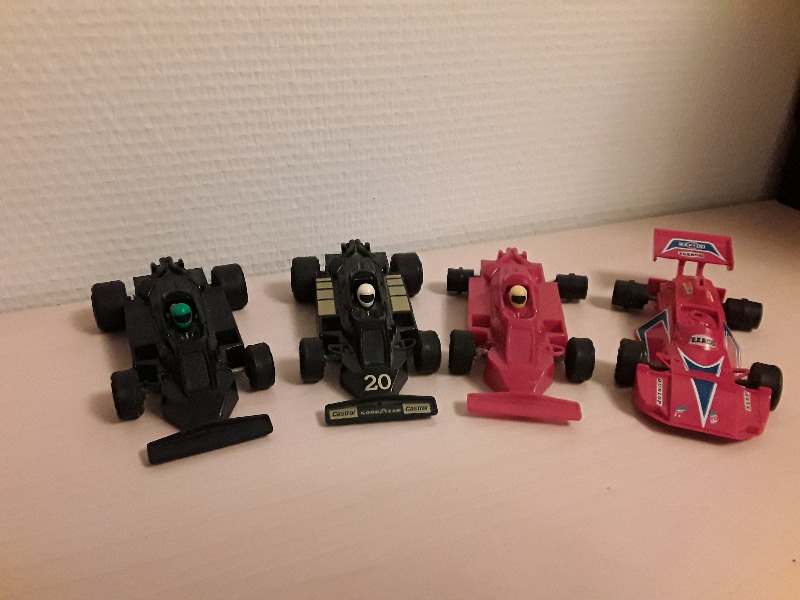 Ostoslista on vielä pitkä. Takaspoilerit ja puuttuva kuskin pää ei vaikuta ajamiseen. Tekniikan puolella sen sijaan on kriittisiä puutteita. Moottorit ja pinionit löytyy, kiitos KaiR, samoin akselit ja takarattaat, mutta edestä puuttuu osaa. Ohjureita ei ole kuin kahteen autoon, ja vain yhdessä autossa on jotain, johon ohjurin saa kiinni.