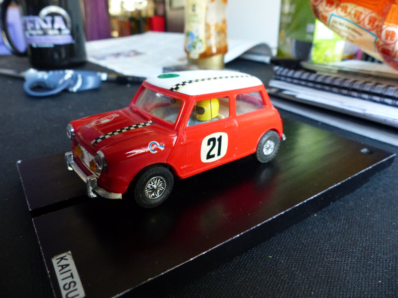 Valitsin autokseni Espanjan Scalextricin (Exin) tuotoksen, joka esiteltiin vuonna 1970. C45 Mini Cooper. Malli on ollut kohtuullisen harvinainen näky Suomessa. Seikkaan vaikuttanee varmaankin se fakta, että mallina se on epäonnistunut. Jostain syystä mallin keula on esikuvan mittasuhteisiin nähden ylipitkä, ja tekee autosta melko omituisen näköisen. Lisäksi alustan ja korin akselivälit eivät ole yhtenevät jolloin etupyörät eivät istu pyöränaukkoihin nätisti. Nämä seikat ovat nähtävissä oheisista kuvista. Tämän tyyliset mokat ovat yllättäviä, sillä tyypillisesti Exinin tuotokset olivat erittäin mittatarkkoja tuohon aikaan ja selvästi hienompia kuin englantilaisen emoyhtiön tuotokset..