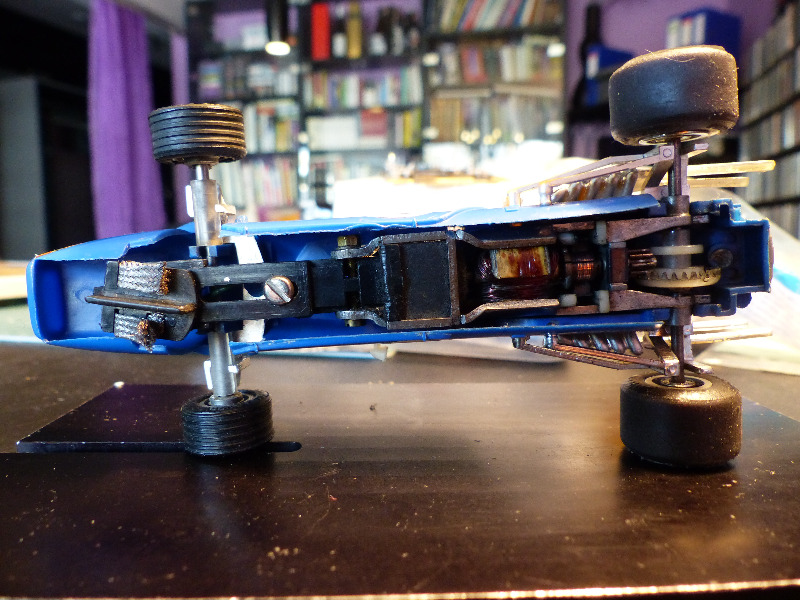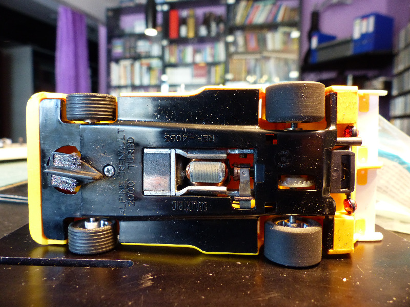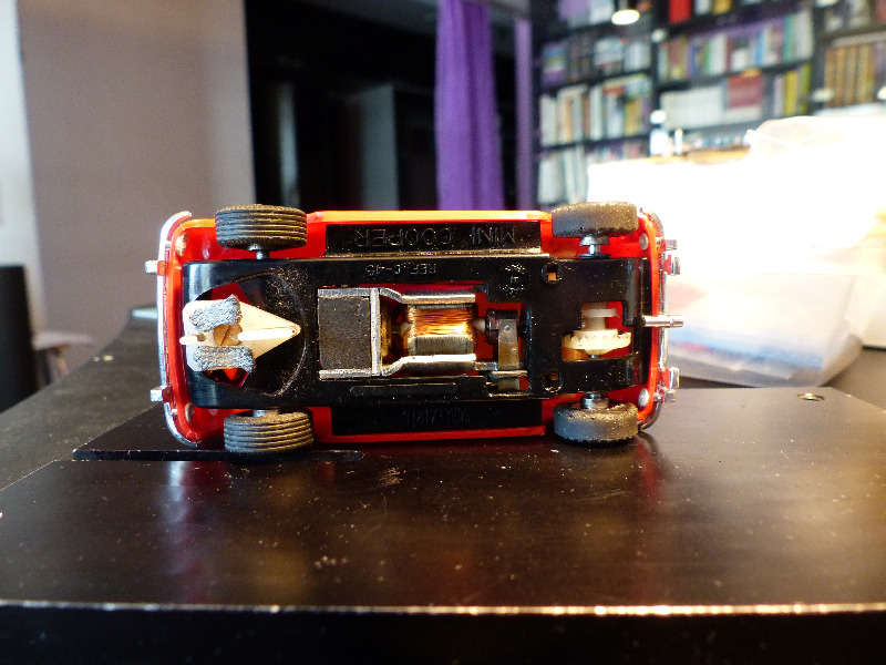 Sisältä likainen kori ja alusta putsattiin ja alkuperäisen moottorin paikalle istutin Scalextricin 25 K pannun 9/27 välityksellä. 27 -kruunuratas taka-akselilla on Slot.it -valmisteinen ja Scalextricin moottorin alkuperäiset virtajohdot vaihdoin Slot.it:lle tyypillisempään malliin. Myös alkuperäistä vastaavan magneetin laitoin moottoripukkiin paikalleen - kyseessä kun ei ollut viritys vaan auton ajokuntoon saattaminen ja alkuperäiseyyden tukeminen.