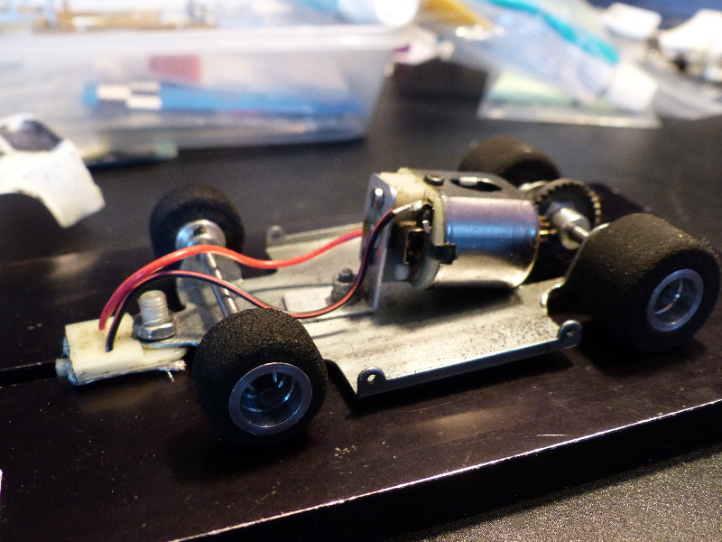Alustaksi päätyi Wompin vakioalusta johon istutin Fleischmannin 1/24 autosta nyysimäni kuulalaakeroidun Mabuchi FT26D-moottorin. Moottorissa on kyllä selkeästi enemmän voimaa kuin aikakauden Wompin vakiokoneessa (Johnson FT16). Hammaskosketuksen oikeellisuudesta mulla näyttää olleen jotain käsitystä 14 vuotiaana, sillä koneen akseli on selkeästi linjattu oikeaoppisesti taka-akselin suuntaan. Toisaalta kone on varsin pystyssä, mikä ei kyllä painopisteen asemoinnin kannalta ole hyvä ratkaisu. Myös moottorin kiinnitykseen käytetty alumiinituki on vedetty rungon läpi tavalisessa M3-koneruuvilla, jonka kanta ei koivin pientä maavaraa mahdollista.